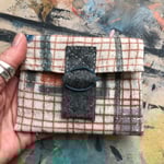 A small patchwork calico pouch made from offcuts of my hand printed and painted fabrics. Painted copper buckle with wool felt strap and lining.